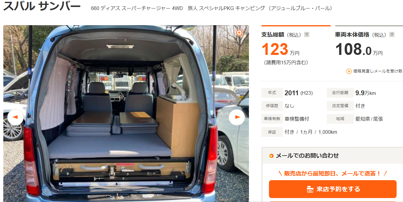 - 主要装備:キャンピング架装「旅人」仕様、寝ベッドキット、折りたたみテーブル、リアゲートテント、ミニシンクなど