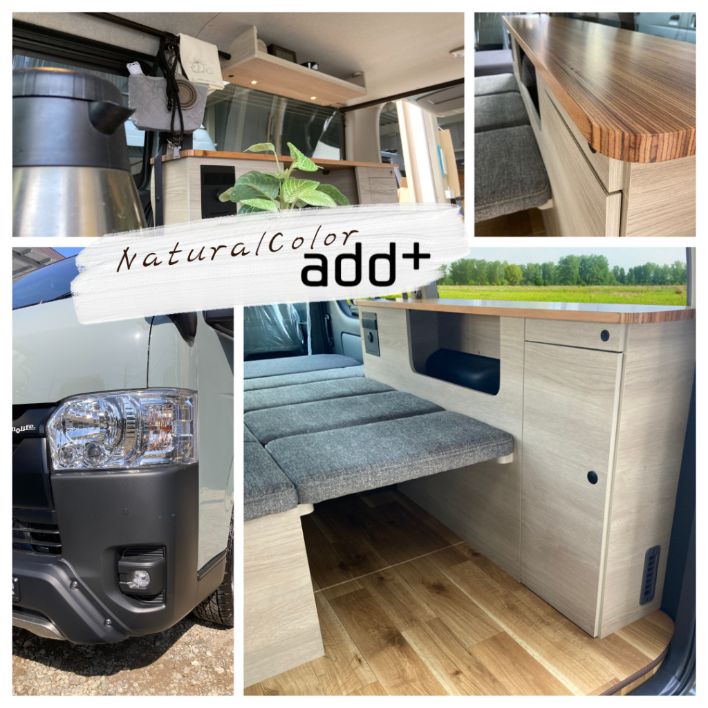 普段使いできるコンパクトな車で、旅先までの移動は最大6人が乗車可能。コンパクトでありながら機能的にまとめたキッチンには電子レンジと冷蔵庫も完備。スペースを効率よく使いkatomotor独自の職人技術と天然木をふんだんに使ったくつろぎの空間と機能性を詰め込んだ理想の一台です。