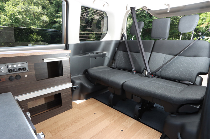 全長5mクラス最大級の圧倒的広々空間!サイドベンチシートベットに展開して寝転がったり座ったりと自由度はNO1!ナッツが本気でリヤエントランスを作ったらこうなりました!