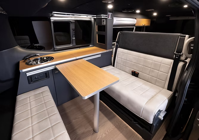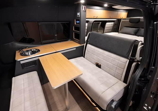 コンパクトなハイエースのボディに快適なリビング、機能的なキッチン、ゆとりのある二段ベッドを兼ね備えた一台。スペースを余すことなく収納も完備し、業界初の上下スライド拡張式の二段ベッドはスライド機構を使って引き出すことで4人が快適に就寝できるベッドに変わり快適な睡眠環境を提供します。