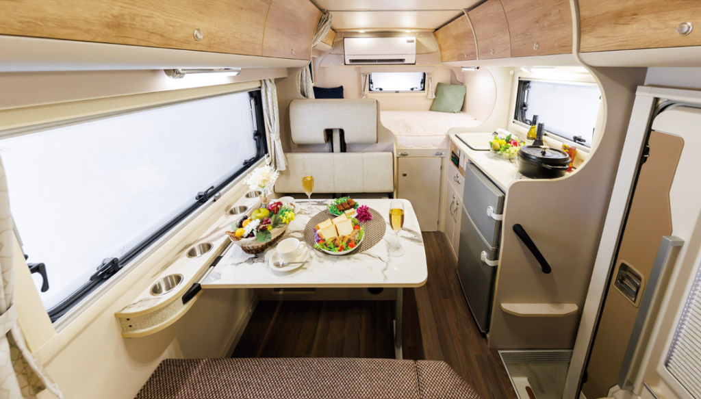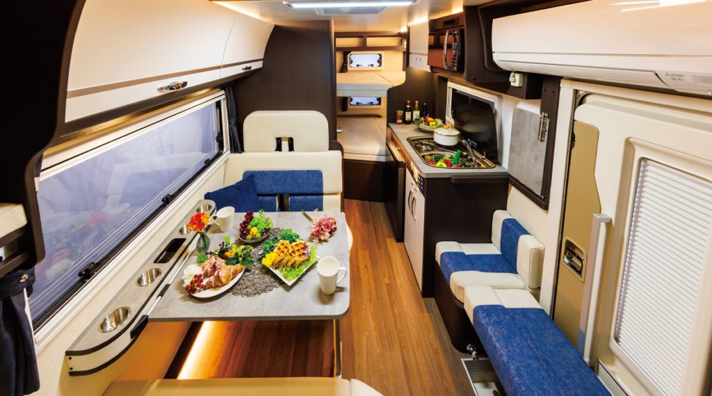 車幅を1950mmに抑え全長を4850mmとして移動を快適にし、コンパクトキャブコンには無かったハイクラスな装備を実現しています。