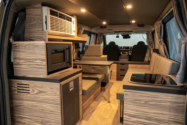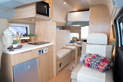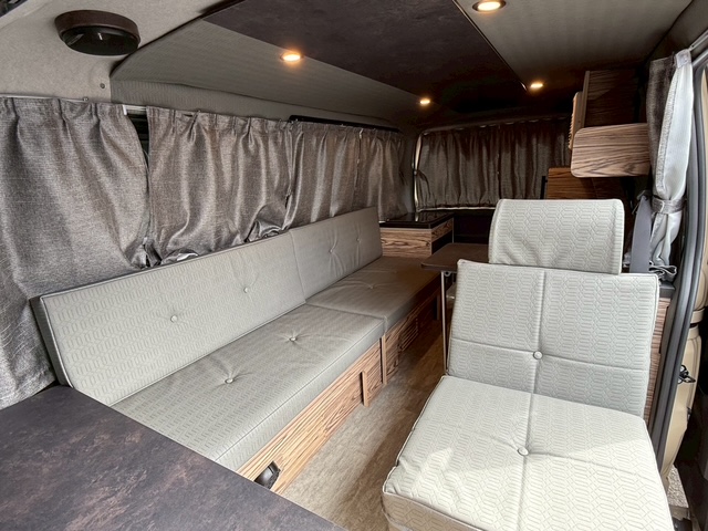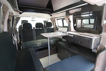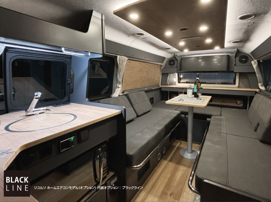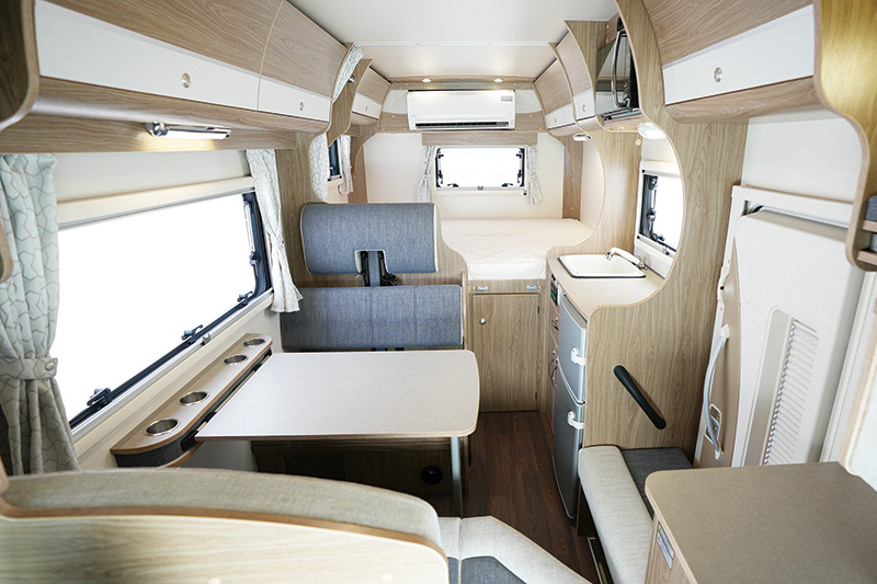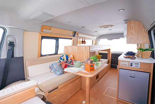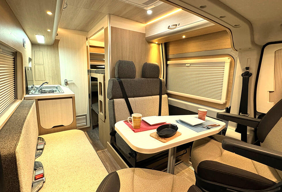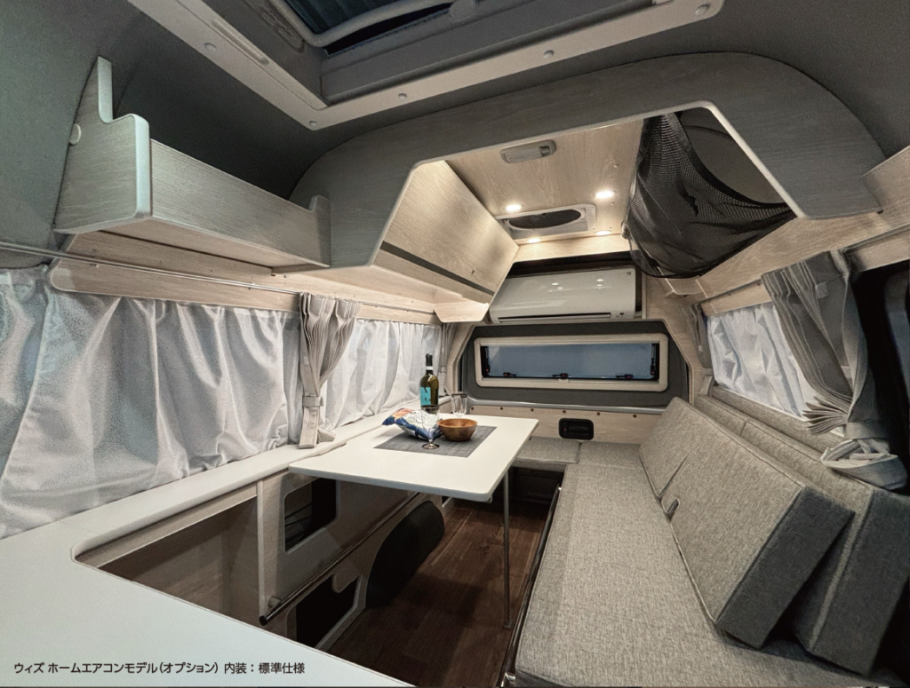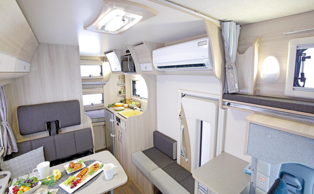 四人乗り二名就寝で、シートアレンジ次第で対面対座シートも可能。オプションでクーラーの装備も可能なモデルです。