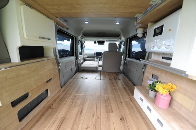 無垢材を使用し木の香りのする癒しの空間 対座が出来て車内も広々!思い立ったらすぐ出発!