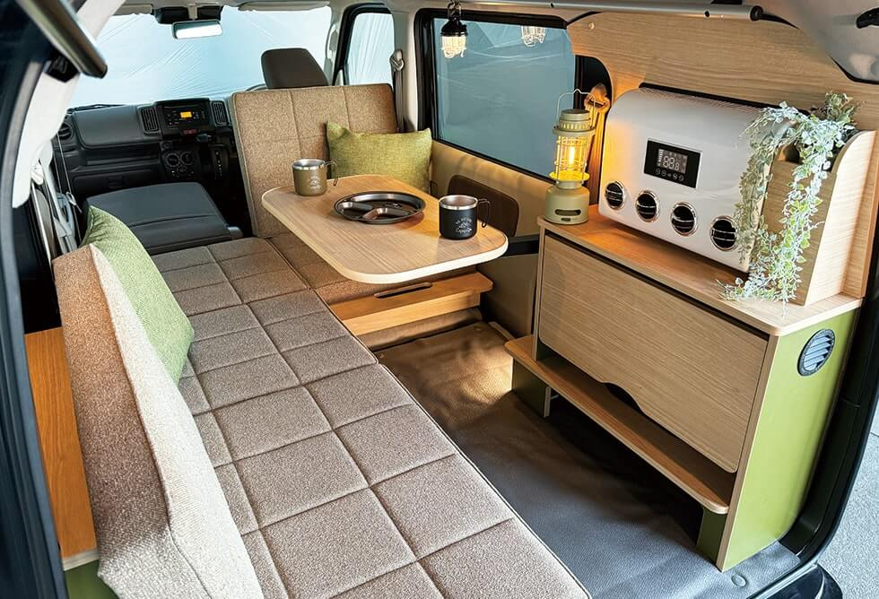 軽ベースキャンパーとは思えない空間の広さに加え、山小屋風の落ち着いた内装に、小回りの利く車両サイズは快適な新しい旅を感じることが出来ます。