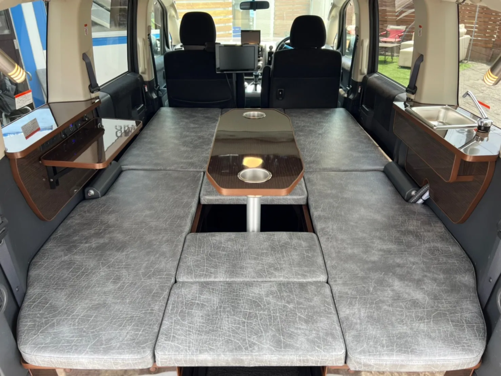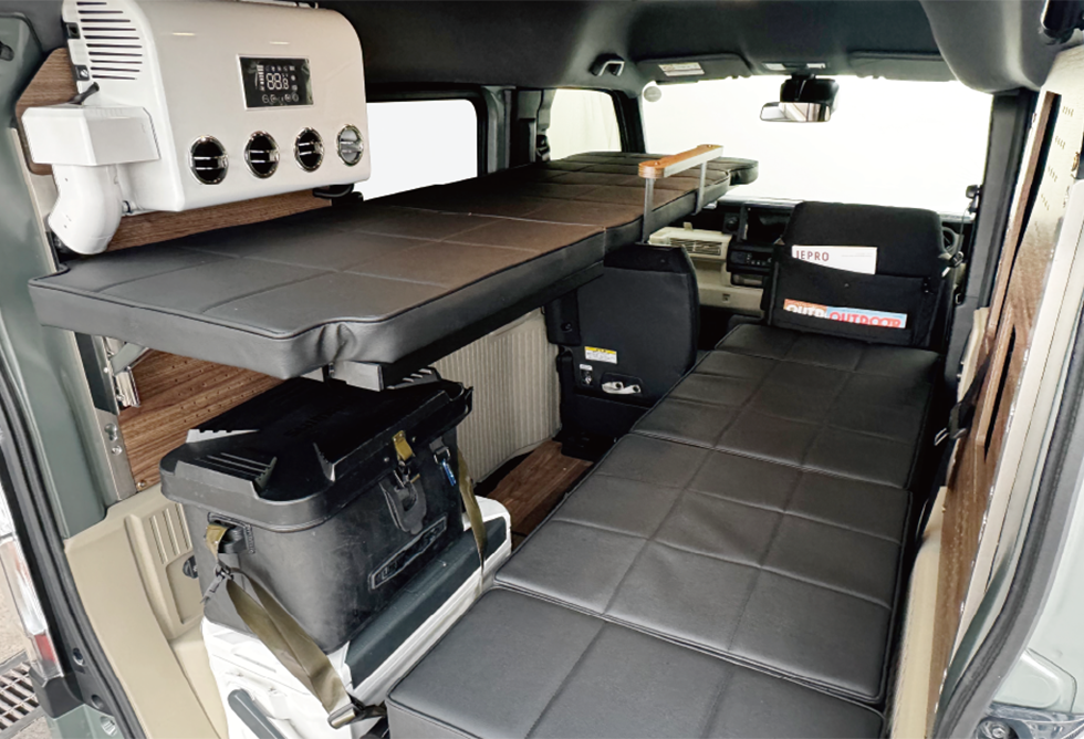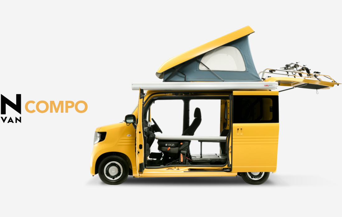 N-VANをベースに助手席からテールゲートまでタテに大きな空間を活かし、車中泊をEnjoyできるVAN LIFEが可能な軽キャンパー