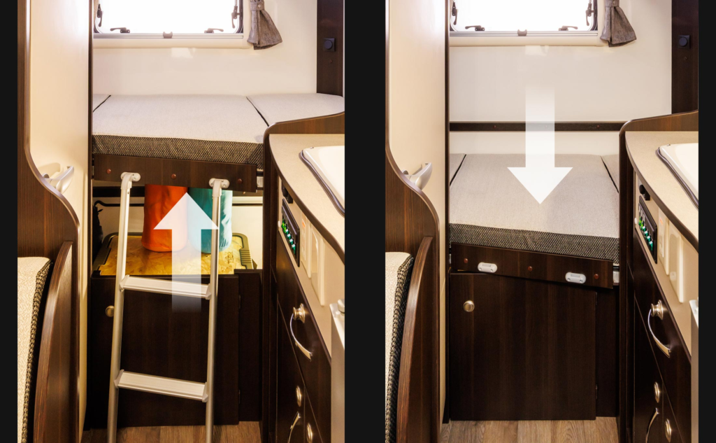 リビング空間と常設のベッドルームを配したレイアウト。「DeltaPro」にリチウムバッテリーを合わせた、ハイブリッドシステムを搭載。空間、機能ともに贅沢に使える1台です。
