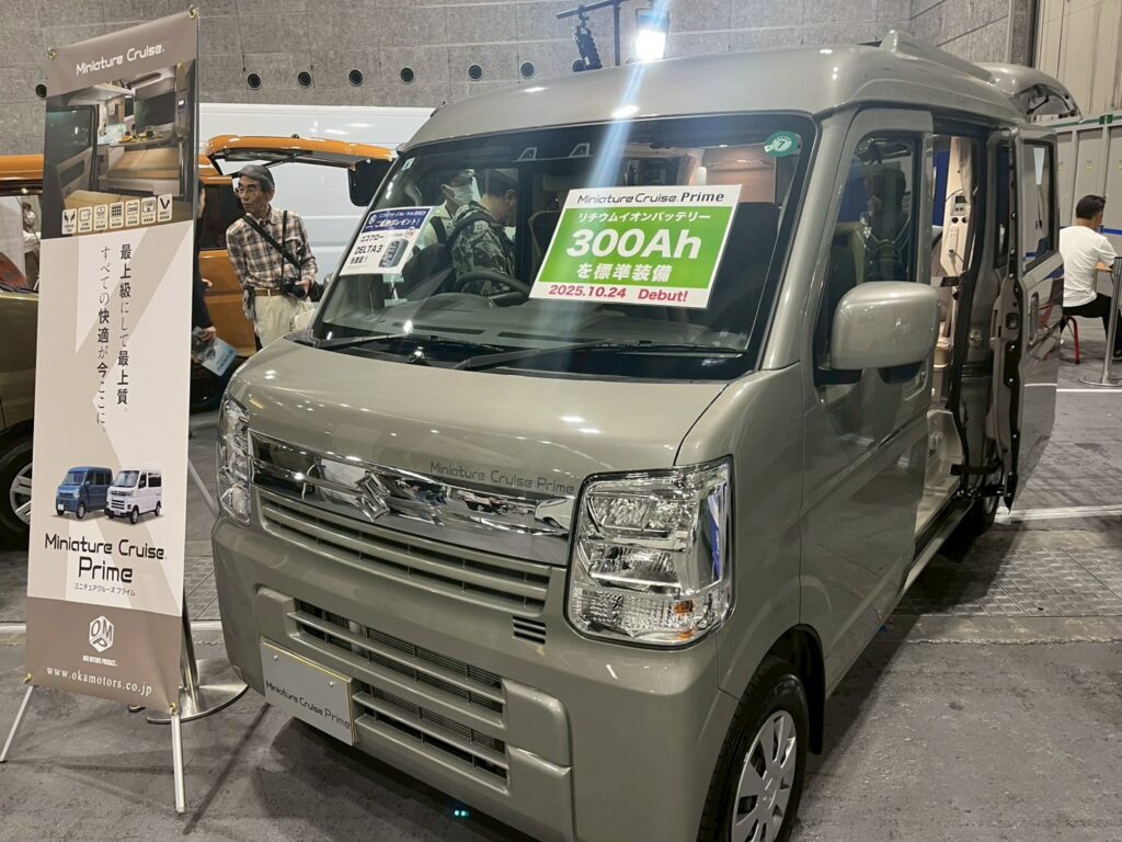 岡モータースの人気ブランド「ミニチュア」シリーズの最上位モデルが劇的にモデルチェンジ。本イベントで初お披露目となりました。軽キャンでありながらリチウム300Ahを搭載し、クーラー・電子レンジを標準装備。これまで以上に快適な車中泊を実現する機能が追加されています。