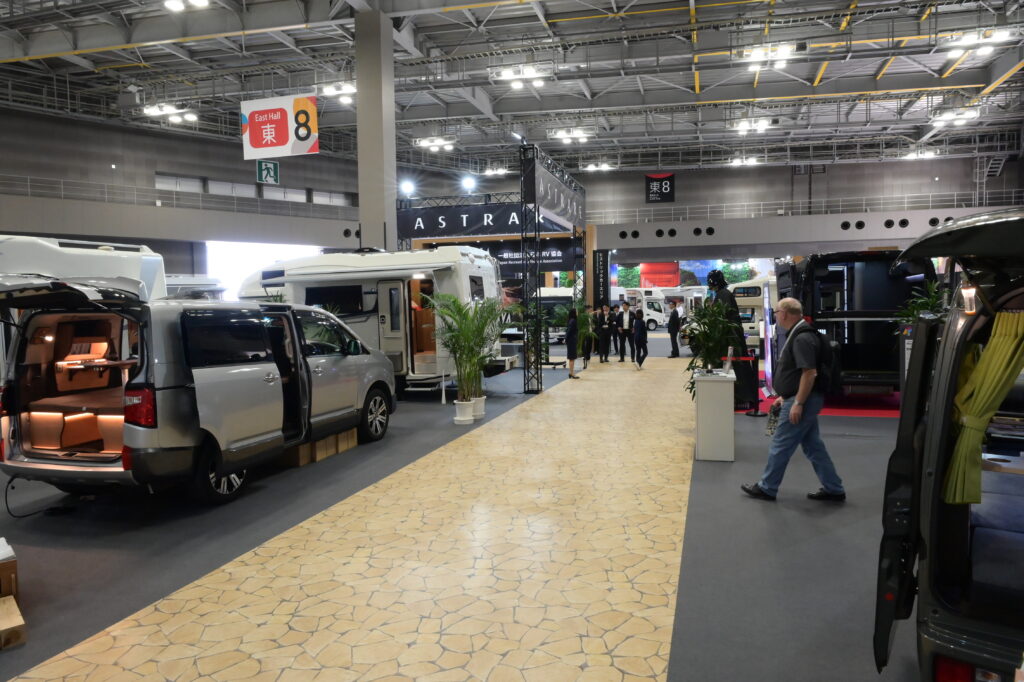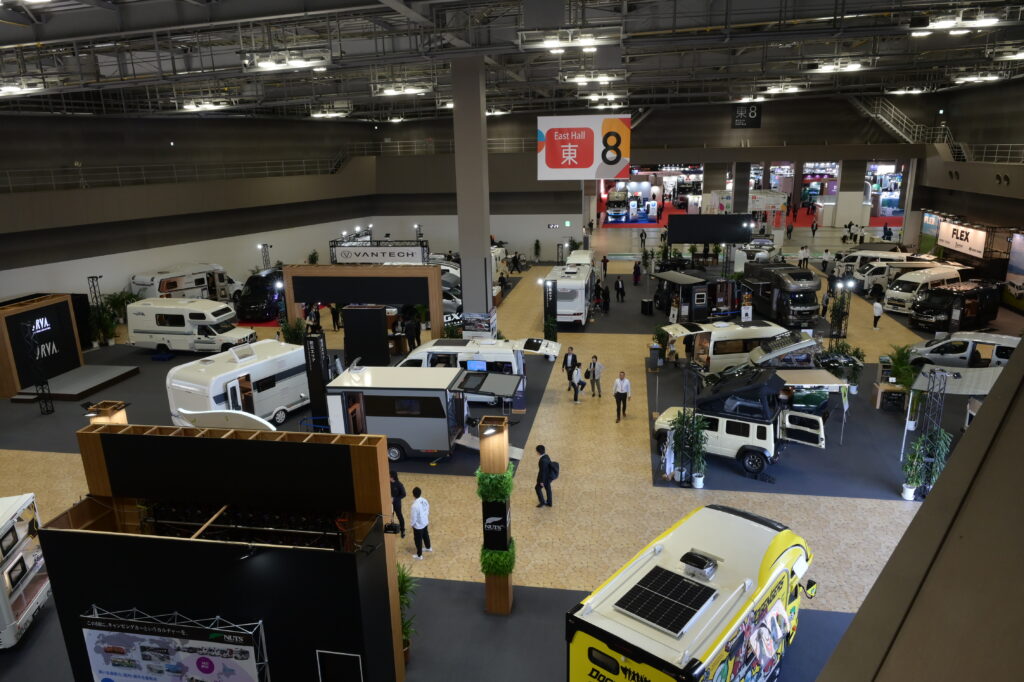 東京ビッグサイト東8ホール全面を使用した「キャンピングカーゾーン by JRVA」約40台展示されていました。