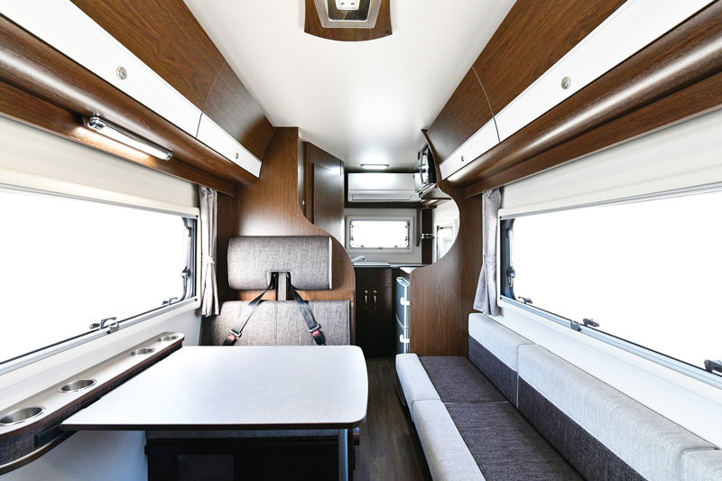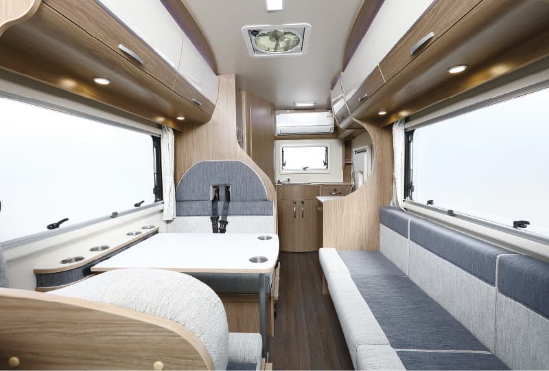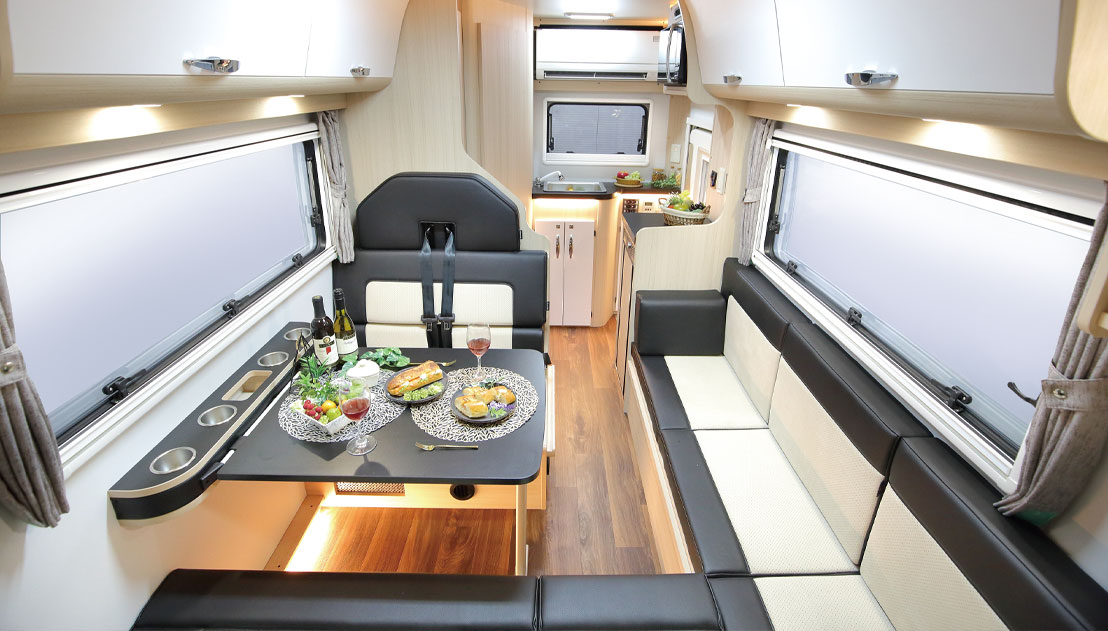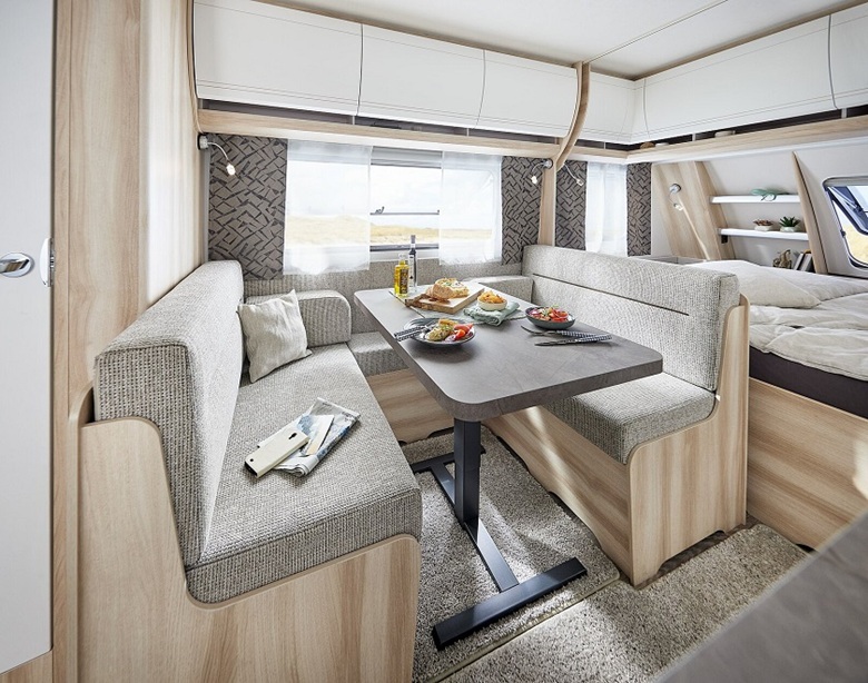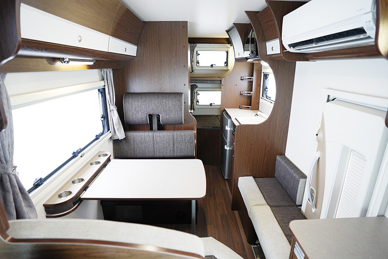 ツインベッドはオプションのベッドスラッツを使用する事で3名の就寝が可能となり、リアには人気のU字ダイネットが備わります。カップルやご家族など幅広い用途で利用可能な人気のレイアウトです。