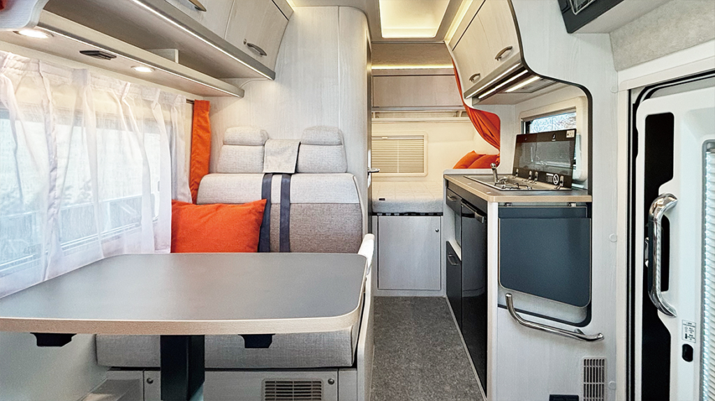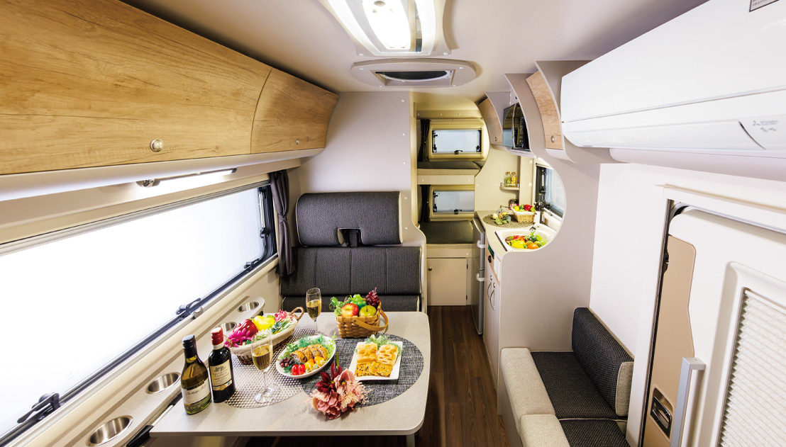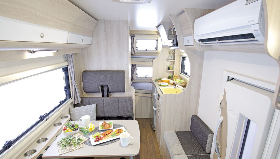 フロントにはメインダイネット、加えて車体中央にも2人掛けのダイネットが備わるツインダイネットは大家族でも使用しやすく、ダイネット全てをベッド展開し、リアの常設ダブルベッドまで加えると最大6名の就寝が可能です。全長約8mで大型ながら全幅は2.25mのナローボディーは日本の道路事情に適した車体です。
