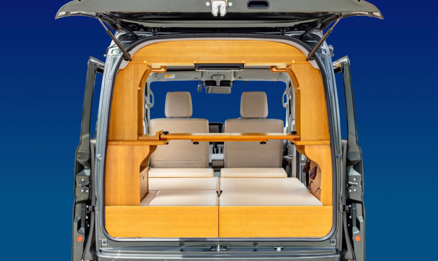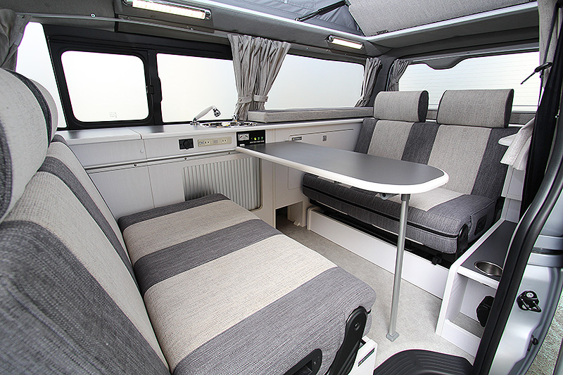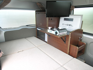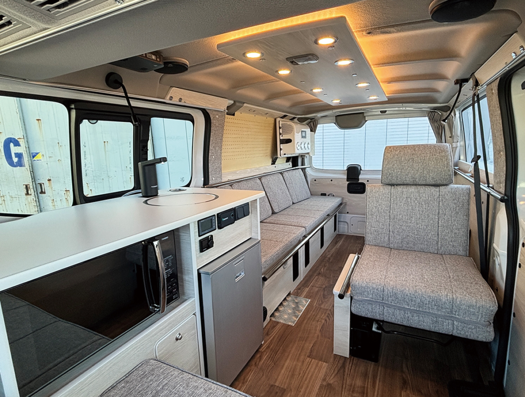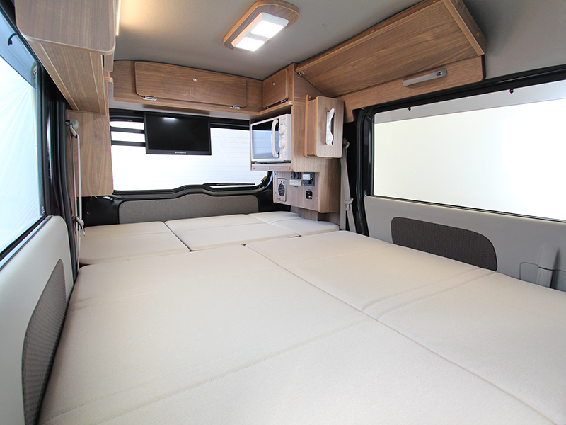 キューブ型の四角い車体のリアパネルは全てがハッチとなりオートバイやバギー、スノーボートやサーフボート等、更には車椅子を積んだり、ペットスペースにするなどスペースを自由にご利用出来ることを前提として設計されています。就寝は電動のプルダウンベッドが備わり最大3名の就寝が可能です。