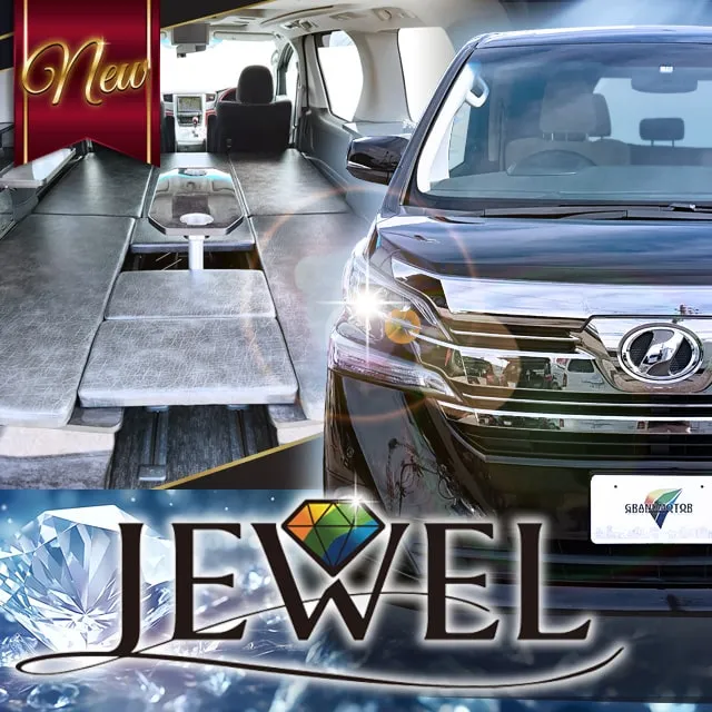 トヨタ・ヴェルファイア/アルファードをベース車として、快適な日常使いをそのままに、本格的な車中泊ライフを可能にしたモデルがJEWEL(ジュエル)です。グレードごとに仕様の異なるベース車両ですが、各モデルで設定が可能になりました。(一部例外車両も有り)内装の家具やベッドマットの素材、オプション装備も各ご用意しております。旧モデル(10系~30系モデル)の製作可能です。