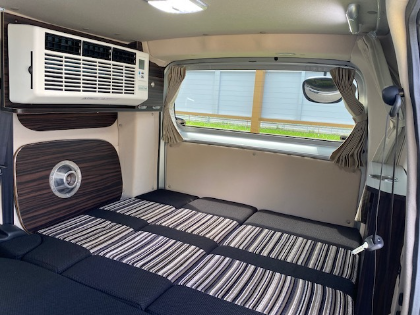 日産キャラバンナロー幅モデルをベースにリアには防水ルーム。家庭用エアコン付き。 ハイエースには無い車体サイズで人気のモデル。