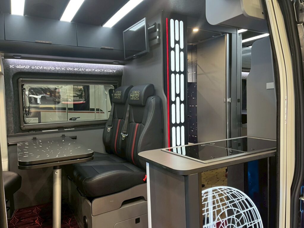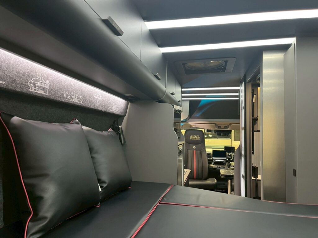 通常のキャンピングカーでは暖色系が主流ですが、本車両ではあえて白色照明を基調にすることで、スター・ウォーズならではの“非日常感”を演出。スイッチパネルで調光操作も可能です。