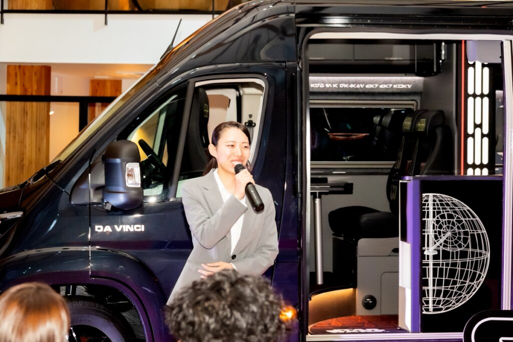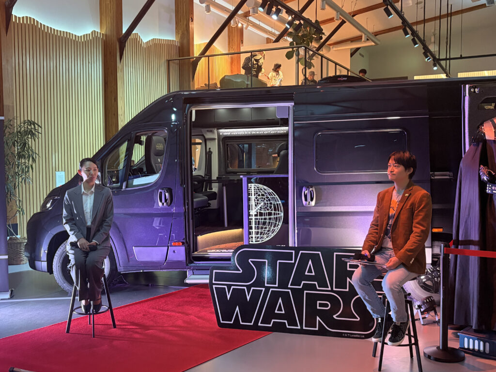 本モデルはディズニーから公式ライセンスを得たキャンピングカーで、世界限定わずか5台の抽選販売という超希少モデル。会場では、開発担当者と熱狂的スター・ウォーズファンによるトークセッションを通じて、その開発背景から細部のこだわりまでが語られました。