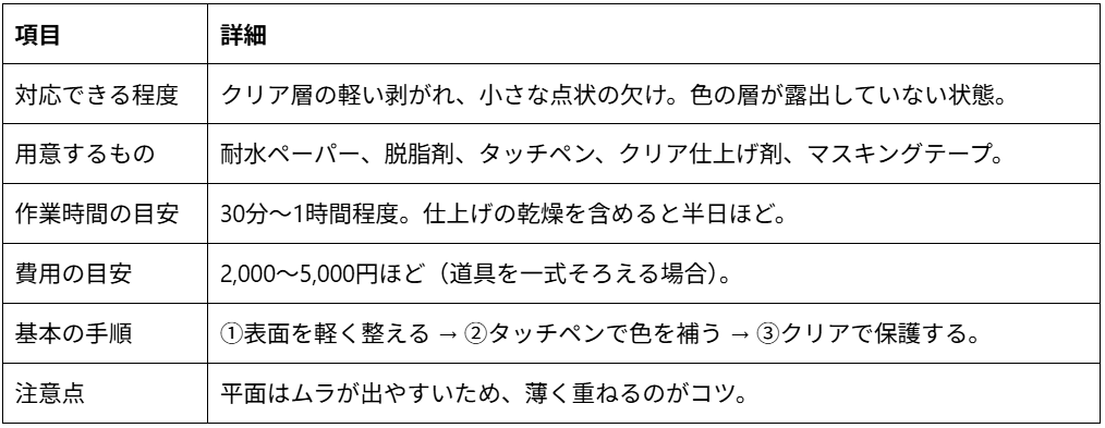 小さな点状の剥がれや、クリア層が少し欠けている程度であれば、自宅でも十分に整えられます。