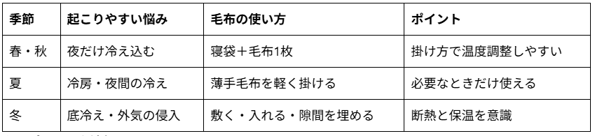 以下で詳しく、季節ごとの毛布の使い方を紹介します。