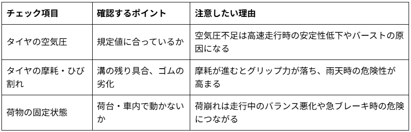 特にキャンピング架装車は車両重量が増えるため、タイヤへの負担が大きくなりやすい点に注意が必要です。