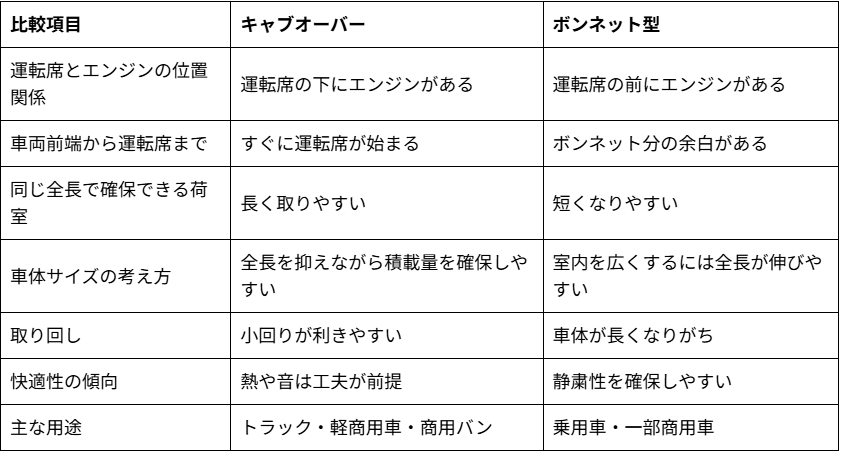ボンネット型は運転席の前にエンジンを搭載する構造で、多くの乗用車がこの形を採用しています。一方、キャブオーバーは運転席をエンジンの上に配置するため、車両前端からすぐにキャビンが始まります。