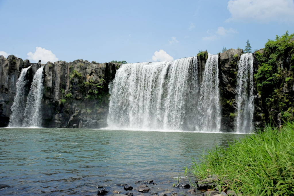 幅およそ120メートル、高さ約20メートルにわたって水が流れ落ちる滝は、間近で見ると想像以上の迫力があります。