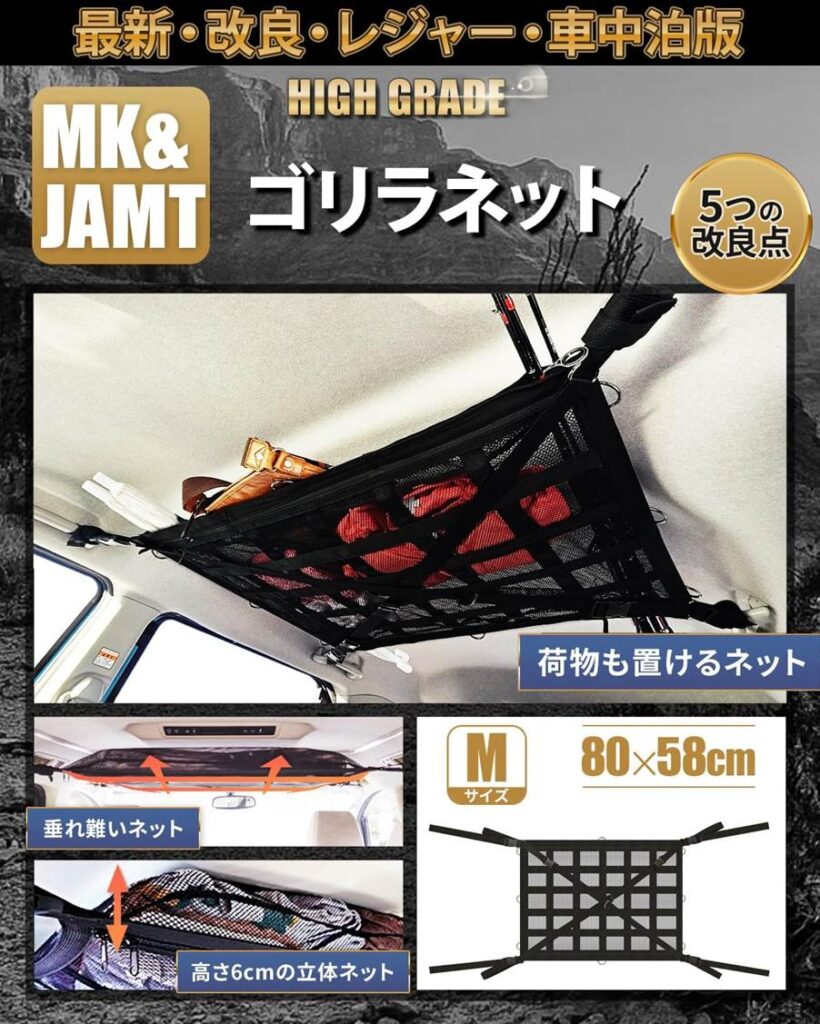 天井ネットは、車内の天井スペースを使って荷物を収納するアイテムです。