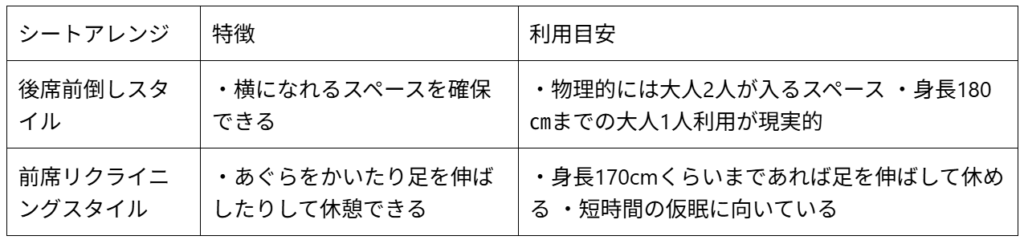 広さや快適性を最優先するならミニバンには及びませんが、ソロ(1人)利用であれば「寝る場所」として十分に成立します。