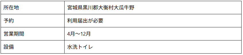 宮城県大衡村の宮床ダム湖畔に位置する自然豊かなキャンプ場です。施設内は開放感があり、周囲に街灯が少ないため夜は満天の星空も期待できます。