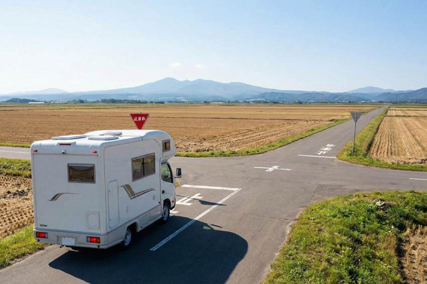 キャンピングカーの旅で特に気をつけたいのが、北海道や東北地方の広大な農道に潜む「田園型事故(十勝型事故)」です。周囲に遮るものがない見通しの良い交差点ほど、お互いが「相手が止まるだろう」と錯覚し、そのまま衝突してしまいます。