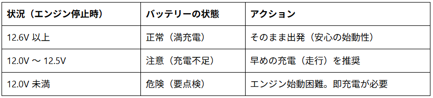 以下の表で、エンジン停止時の電圧と状態の目安を確認してください。