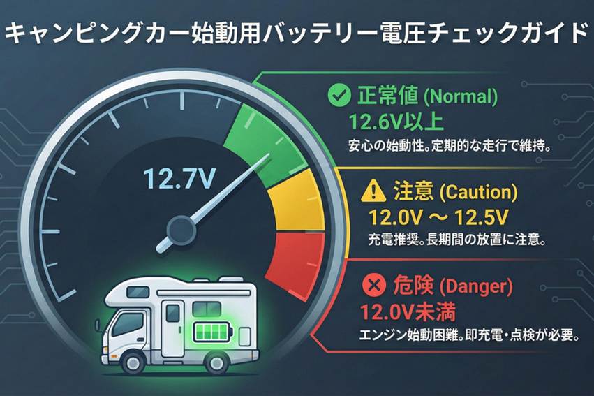 キャンピングカーのエンジンが確実にかかるかどうかを見極めるため、運転席の電圧計から一瞬で状態を把握するスキルが求められます。バッテリーのコンディションを確認する際は、まずは「エンジン停止時の電圧」をチェックするのが鉄則です。