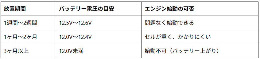 1ヶ月放置しているなら: 危険ゾーンです。そのままではエンジンがかからない可能性が高いため、事前の充電が必須です。