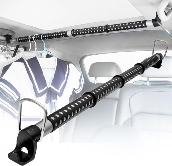 車内の天井部分に取り付けて使うバータイプのグッズで、ハンガーやバッグなどを掛けて収納できます。