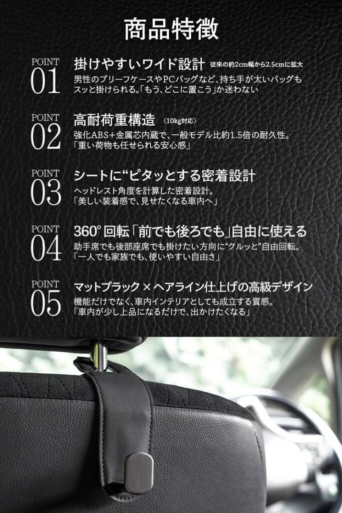車内の雰囲気を崩さない、おしゃれな荷物掛けを探している方におすすめなのがこのヘッドレストフックです。