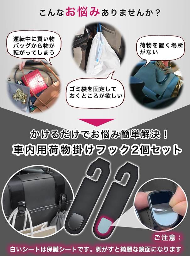 助手席に取り付ければ、バッグや買い物袋を掛けることができ、車内で倒れたり散乱したりするのを防げます。