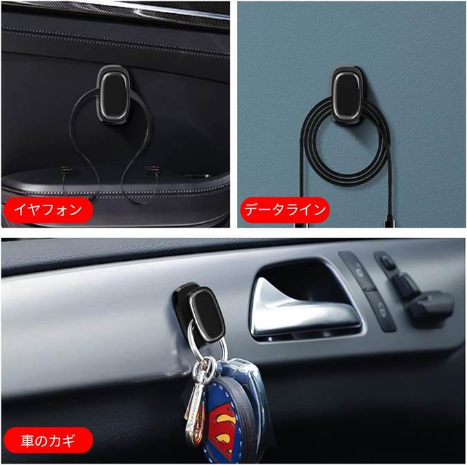 粘着テープや吸盤で車内に取り付けるタイプの荷物掛けです。粘着タイプはダッシュボード周りやドア付近など、好きな場所に設置できるのが特徴で、鍵やゴミ袋、ケーブル類を掛けたいときに重宝します。