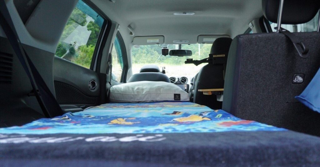 後部座席を倒せばフラットに近いスペースが確保でき、マットを敷くことで快適な寝床になります。